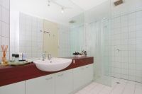 Further more is the good sized bedroom offering mirrored built-in robes and a glossy bathroom with a walk-in shower and floor-to-ceiling tiles.